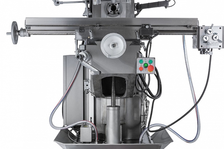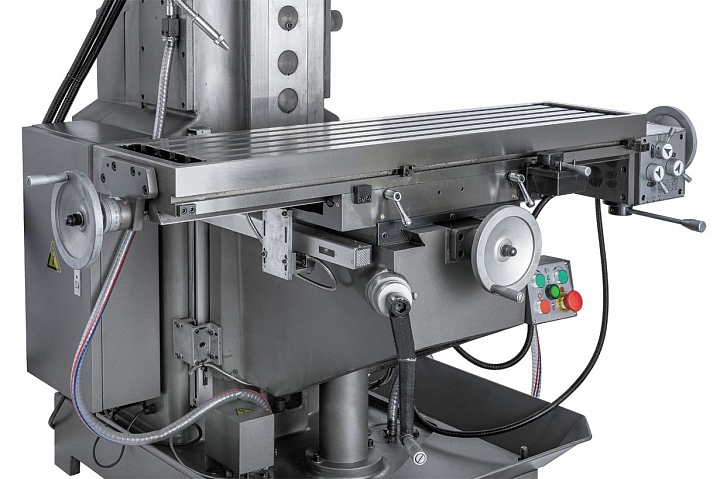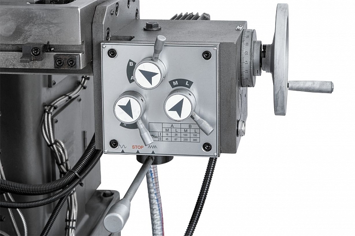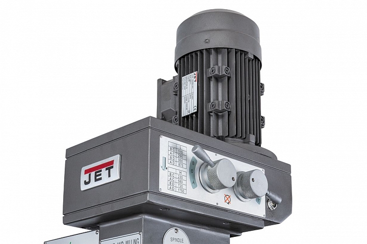 На станке JET JMD-1144GHV DRO можно производить сверление отверстий до диаметра 30 мм и фрезеровать концевыми фрезами до диаметра 20 мм. На станке установлены вертикальный шпиндель мощностью 1,5 кВт и горизонтальный шпиндель 2,2кВт со скоростями вращения в диапазонах 115-1750 и 40-1300 об/мин соответственно. Расстояния между вертикальным шпинделем и столом от 70 до 420 мм, вертикальным шпинделем до колонны от 200 до 650 мм; горизонтальный шпиндель-стол – от 15 до 365мм. Выбор скоростей вертикального шпинделя осуществляется с помощью 8-ми ступенчатой коробки скоростей и имеет предустановленные скорости: 115, 230, 290, 360, 580, 720, 875, 1750 об/мин.