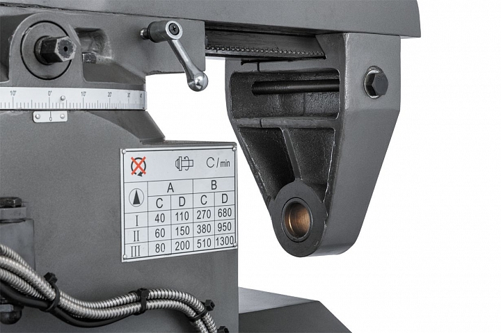 Скорость вращения горизонтального шпинделя изменяется с помощью 12-ти ступенчатой коробки скоростей со следующими значениями: 40, 60, 80, 110, 150, 200, 270, 380, 510, 680, 950, 1300 об/мин.